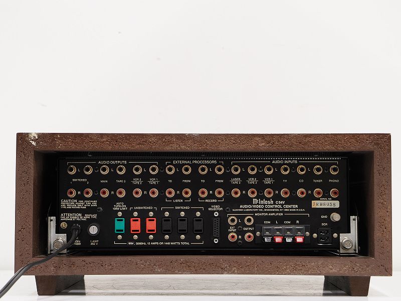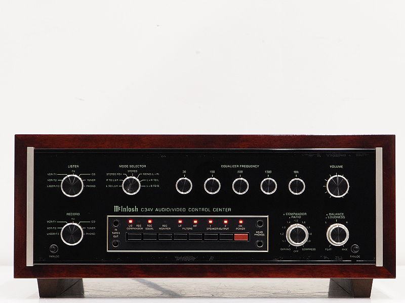 C34Vは、多彩な入力系統と高品位なフォノ回路を備えたコントロールアンプで、マッキントッシュらしい厚みのある音質と高い操作性を兼ね備えた人気モデルです。ウッドケース付仕様は外観の美しさも魅力のひとつです。